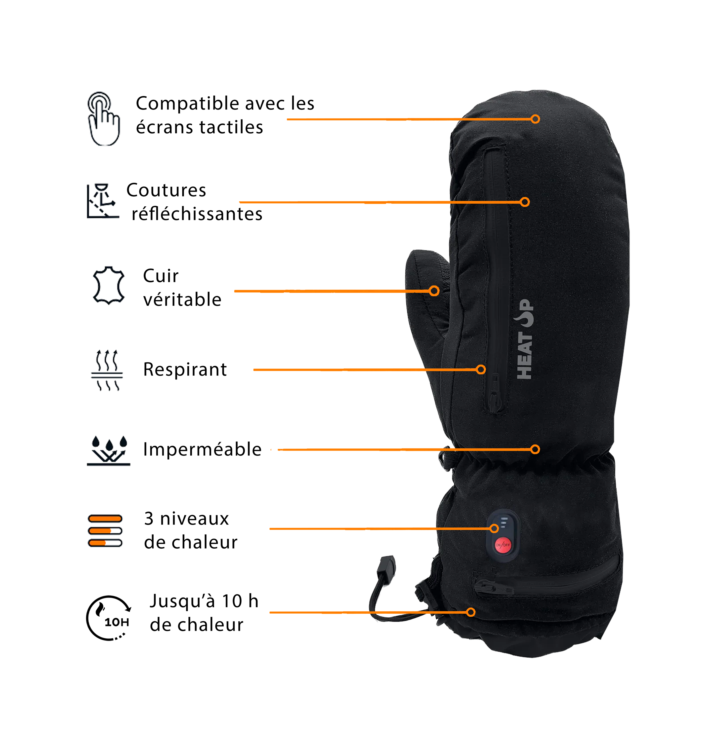 Ces mitaines chauffantes sont un incontournable pour affronter le froid avec style et confort. Fièrement conçues par notre entreprise québécoise, les mitaines de la série MOUNTAIN sont fabriquées en cuir véritable et dotées d'une membrane imperméable et respirante, vous enveloppant de chaleur agréable tout en permettant à vos doigts de bouger librement. Grâce à une technologie de chauffage avancée, vous pouvez facilement ajuster la température sur trois niveaux, que vous soyez en promenade extérieure ou à soutenir vos proches sur la glace. Avec ces mitaines, vous n’aurez pas à faire de compromis : restez actif tout en gardant vos mains au chaud. Tous nos produits sont accompagnés d'une garantie de 1 an pour votre tranquillité d'esprit.