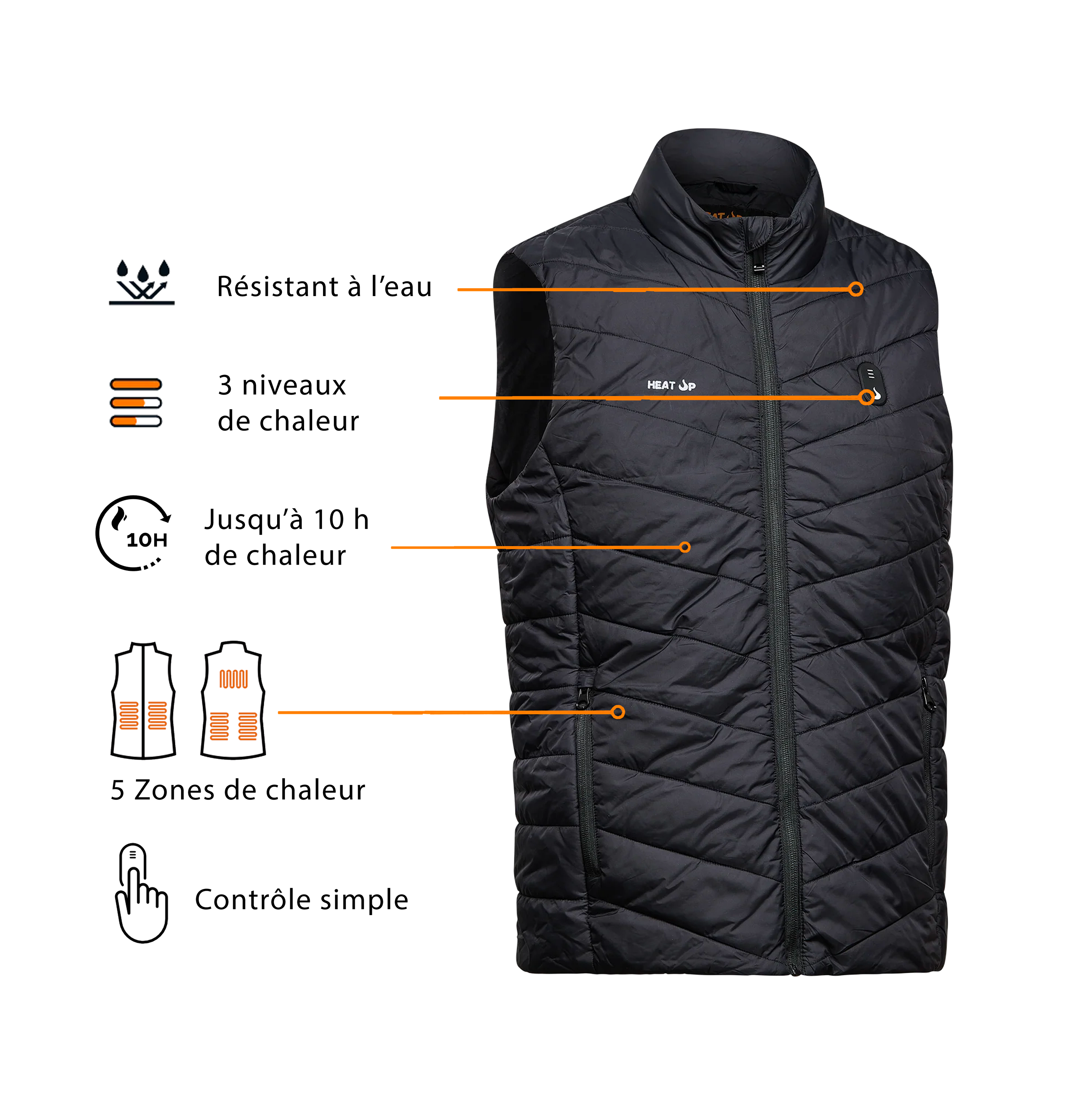 Zones de chauffage stratégiques (poitrine, dos et reins) pour une chaleur équilibrée