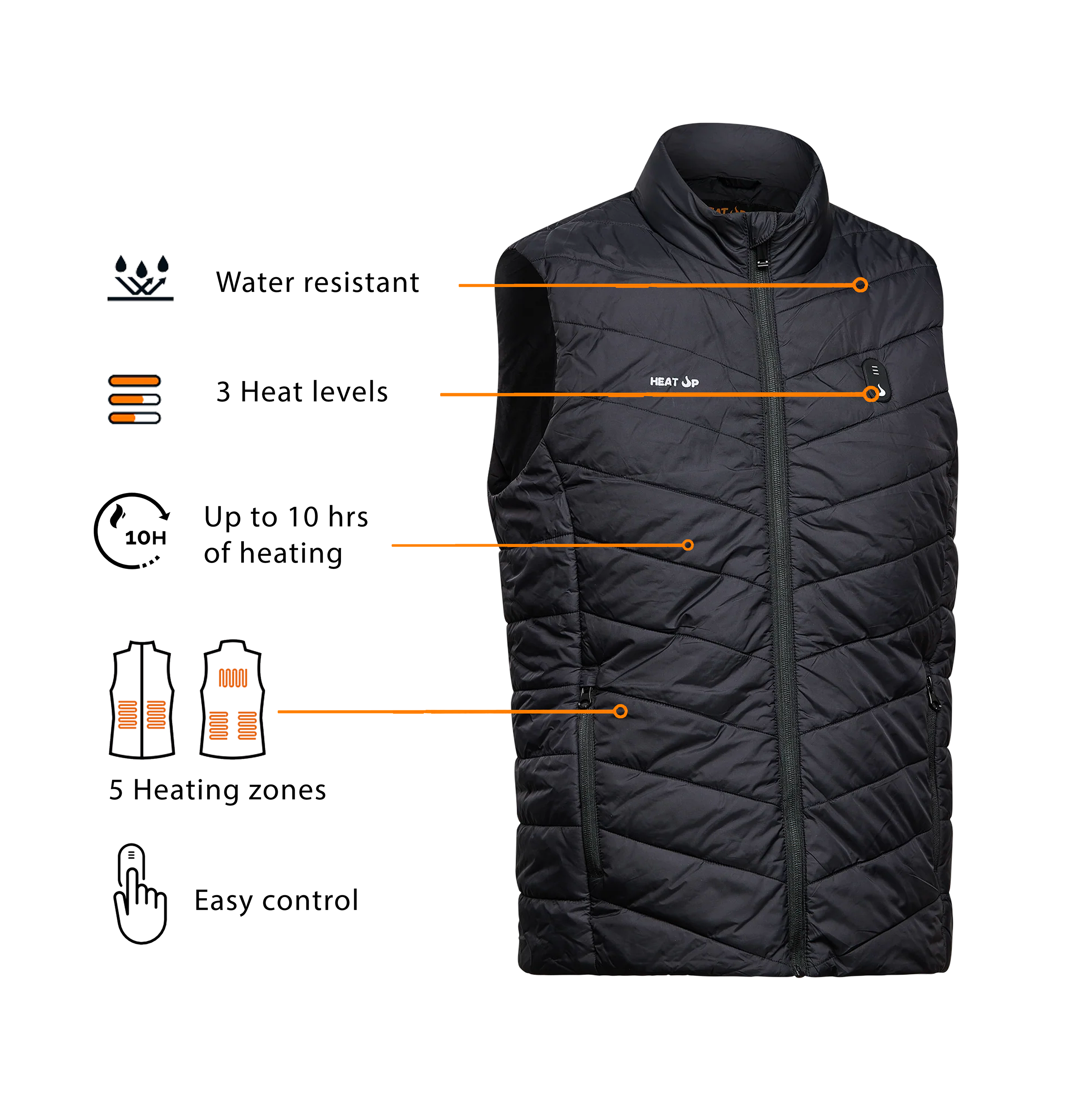 Strategically placed heating zones (chest, back, and kidneys) for balanced warmth